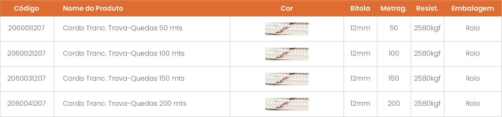 O trava quedas é uma corda de 12mm de espessura e trançado triplo feito de poliéster virgem, um material extremamente resistente que suporta cerca de 2,5 toneladas de peso.